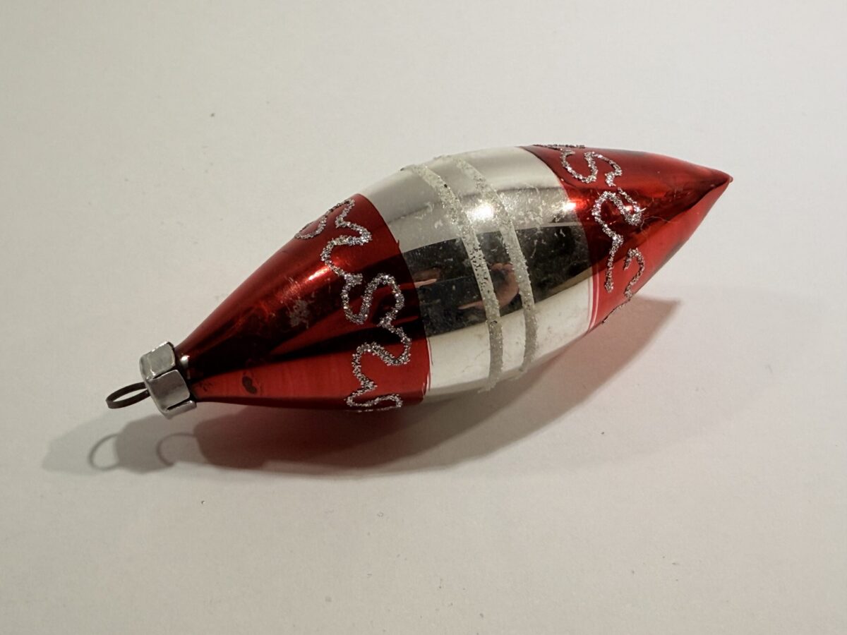 Flot ældre juletræskugle i rød og sølv og med form som en dråbe. Den er lavet i fint og tyndt glas og fremstår i flot stand med få brugsspor.