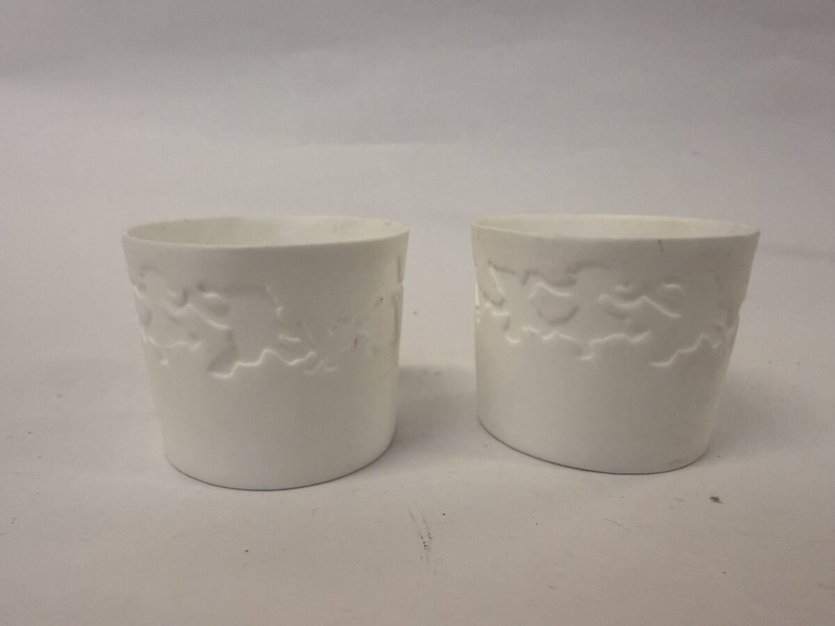 Royal Copenhagen små fyrfadsstager med dansende julenisser i relief der smukt lyser op med tændt fyrfad. De er fremstillet i bisquit porcelæn i serien White Christmas, designet af Finn Næss-Schmidt. De fremstår i hel og fin stand.