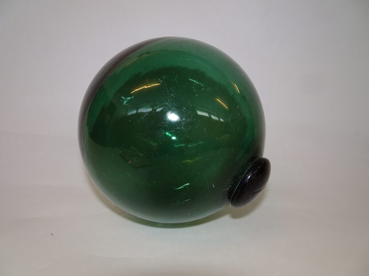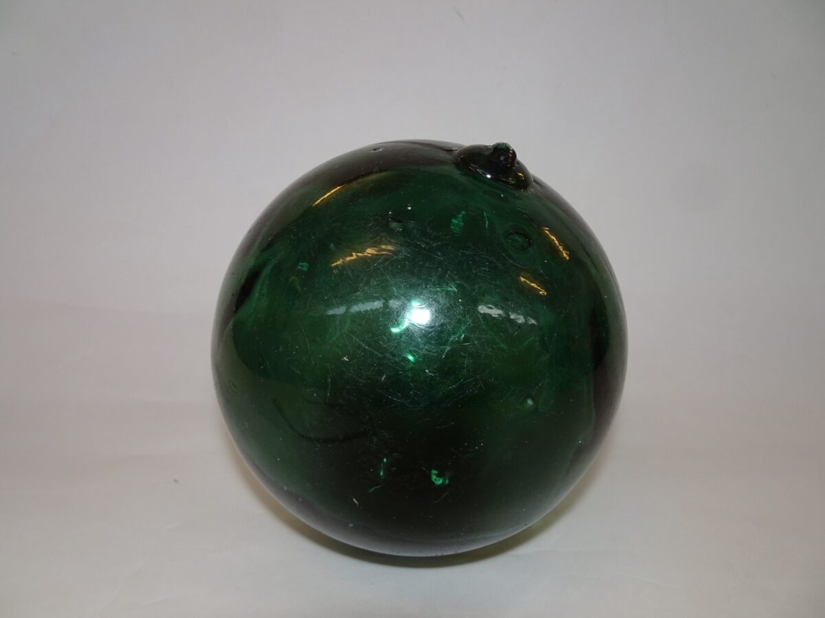 Flot gammel fiskekugle i grønt glas. Den fremstår med brugsspor fra dens tid i vandet, hvor den markerede fiskernes net. Den fremstår dog i flot og hel stand.