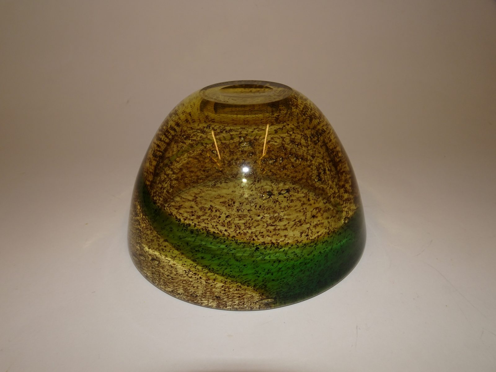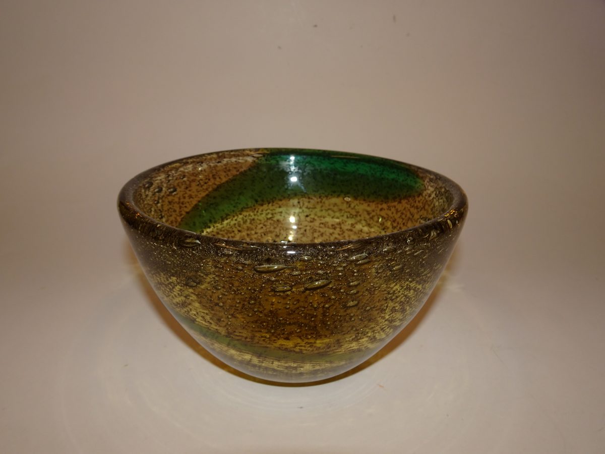 Meget smuk glasskål – Cascade – formgivet af Gunnar Ander for glasværket Lindshammar i Sverige. Den fremstår med meget smukke gyldne og grønlige farver – i hel og flot stand. Signeret Lindshammar Sweden G. Ander 1269.