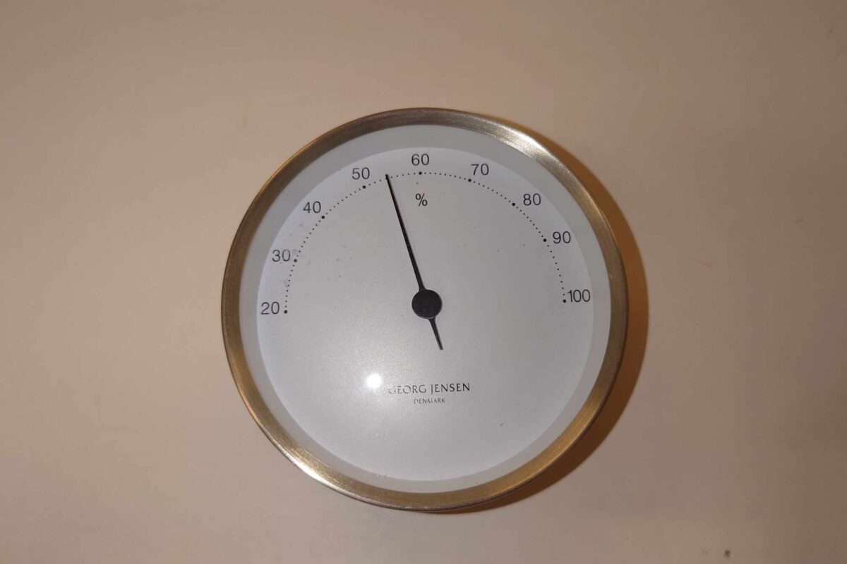 Flot hygrometer i Henning Koppels ikoniske design for Georg Jensen. Hygrometeret er med kant i rustfri stål og fremstår i fin og fejlfri stand.