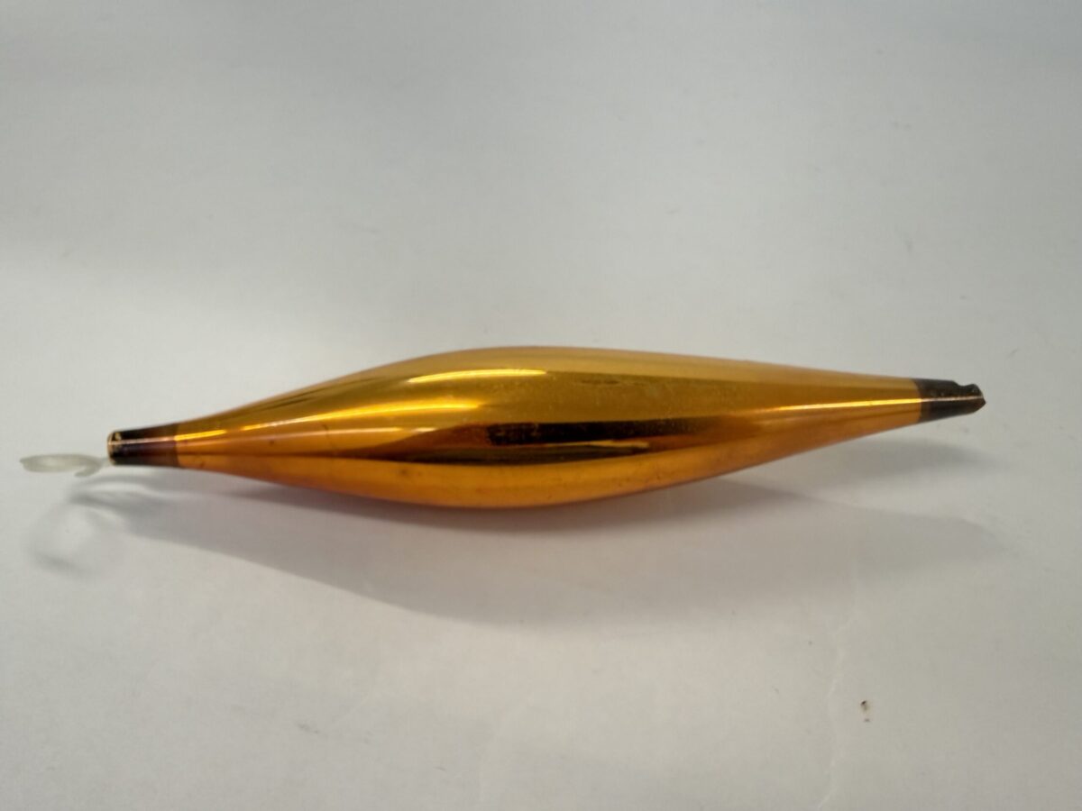 Flot lang og smal dråbe som juletræskugle i tyndt glas. Den fremstår med alderssvarende patina. Obs mgl. metalophæng, er erstattet af plastophæng. Gem et fra en kugle der går i stykker eller tag et fra en nyere billig kugle og sæt i.