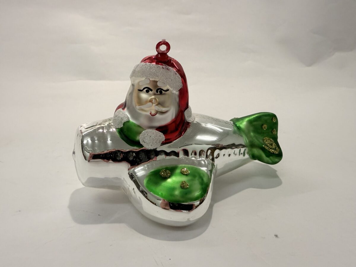 Fin nyere juletræskugle i form af flyvemaskine med julemanden i. Den fremstår i fin og hel stand,