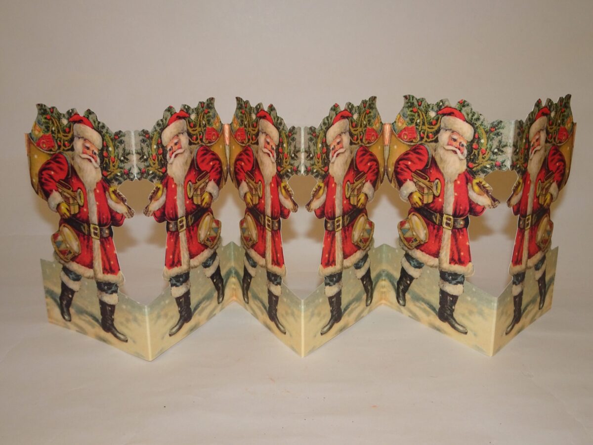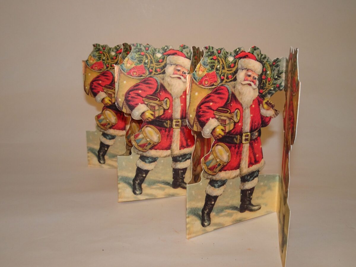 En utrolig sød, retro, papirrad med julemanden der bærer på alle gaverne. Der er identisk tryk på begge sider så den kan stilles uafhængigt af dette.
