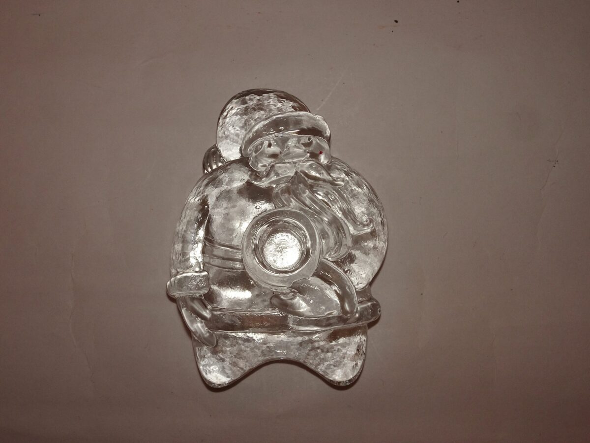 Flot glaslysestage til kertelys / juletræs lys. Julemanden er blevet træt og ligger ned – der er lige en plads til et lys i maven på ham. Den fremstår i flot og hel stand.