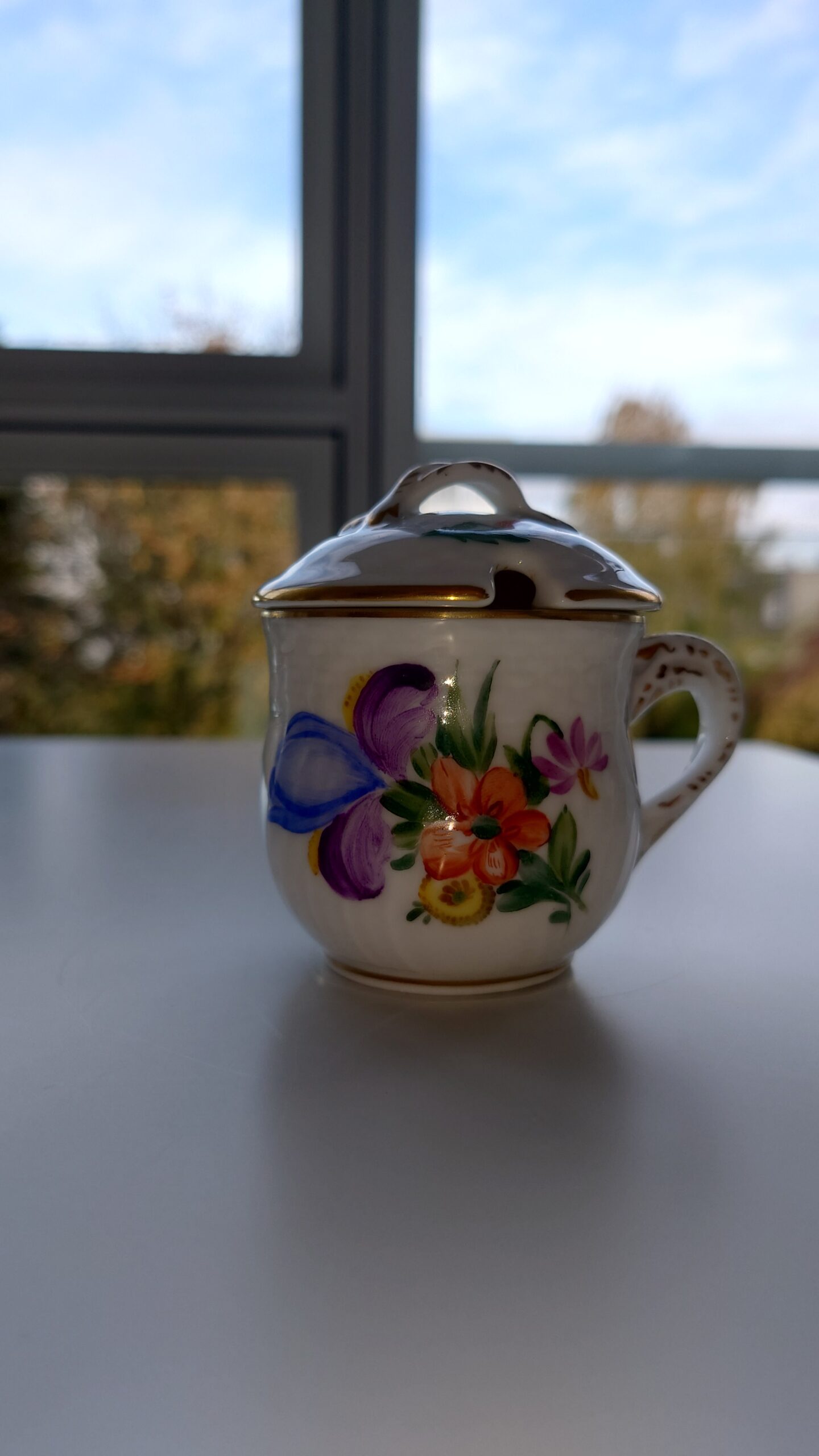 Flot sennepskrukke i stellet Let Saksisk Blomst fra Royal Copenhagen. Stellet er et af de ældste der er lavet hos Kongelig Porcelæn med flotte farverige blomster og smuk guldkant. Sennepskrukken har et fint lille hul ved låget så skeen kan stå i krukken. Den fremstår i flot og hel stand i 2. sort. med nr. 493/1594.
