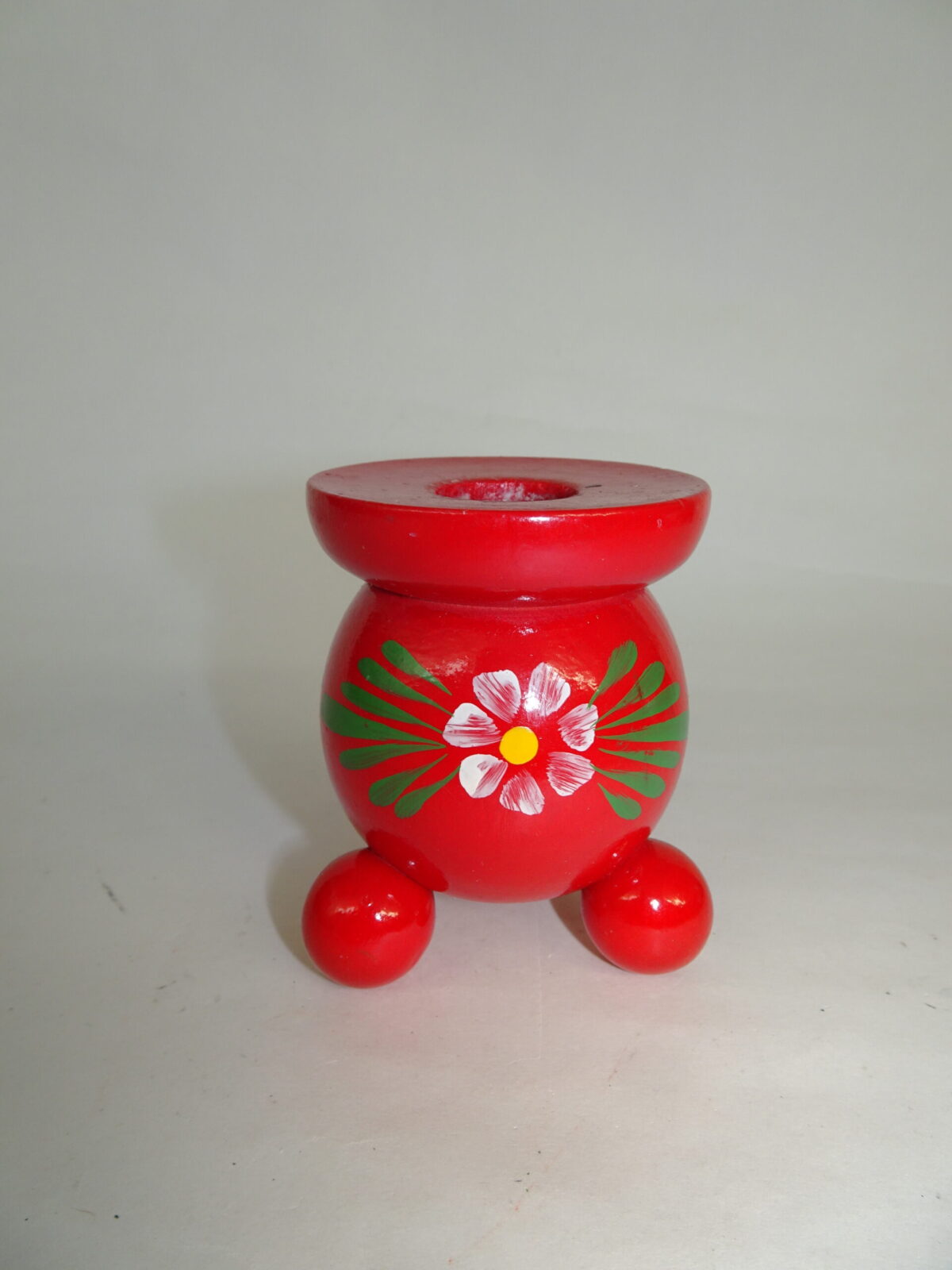 Klassisk svensk lysestage i træ med små kugler som fødder. Malet i de klassiske farver fra Dalarne – der hvor hestene også er fra. Den fremstår med smuk patina. Den passer til et almindeligt lys.